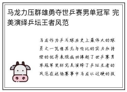 马龙,作为乒乓球历史上最伟大的球员之一,...