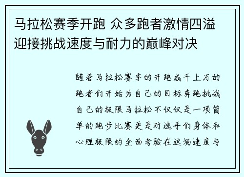 随着马拉松赛季的开跑,成千上万的跑者们开...