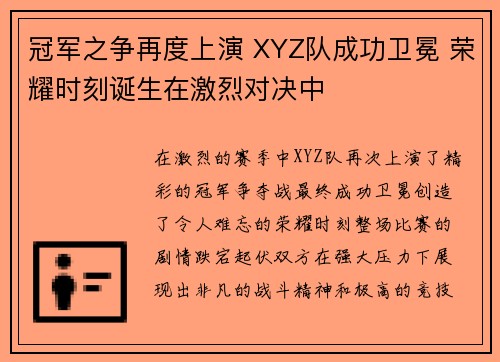 在激烈的赛季中,XYZ队再次上演了精彩的...