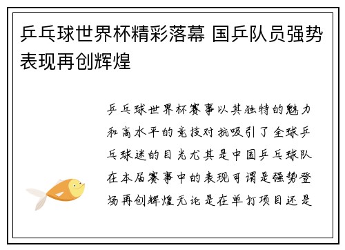乒乓球世界杯赛事以其独特的魅力和高水平的...