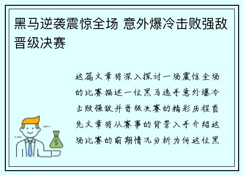 这篇文章将深入探讨一场震惊全场的比赛,描...