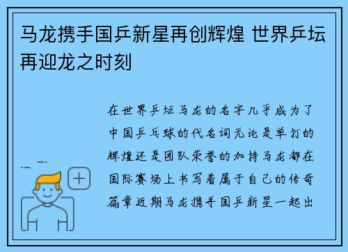 在世界乒坛,马龙的名字几乎成为了中国乒乓...