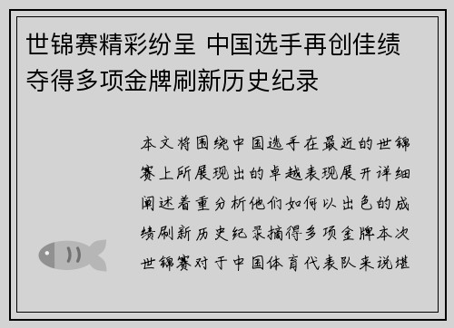 本文将围绕中国选手在最近的世锦赛上所展现...