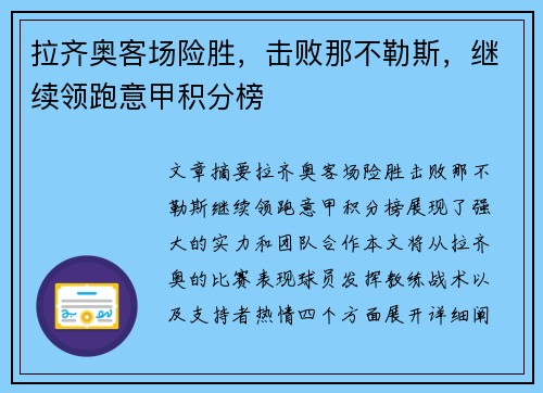 文章摘要:拉齐奥客场险胜,击败那不勒斯,...