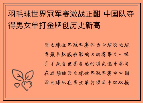 羽毛球世界冠军赛作为全球羽毛球界最具权威...