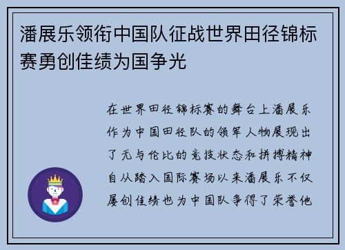 在世界田径锦标赛的舞台上,潘展乐作为中国...