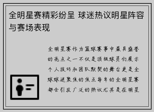 全明星赛,作为篮球赛事中最具盛誉的亮点之...