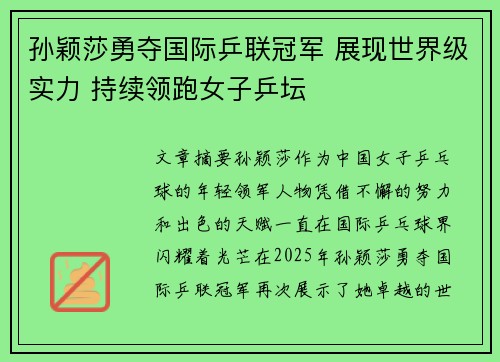 文章摘要:孙颖莎,作为中国女子乒乓球的年...