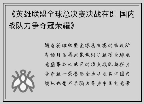 随着《英雄联盟》全球总决赛的临近,所有的...