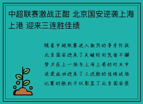 随着中超联赛进入激烈的争夺阶段,北京国安...