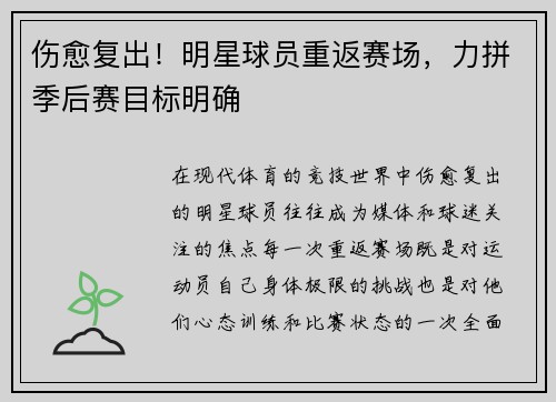 在现代体育的竞技世界中,伤愈复出的明星球...