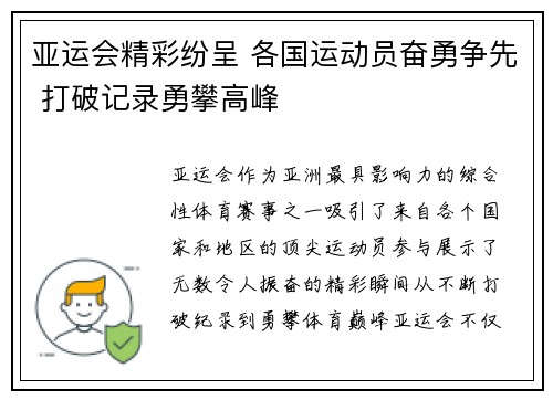 亚运会作为亚洲最具影响力的综合性体育赛事...