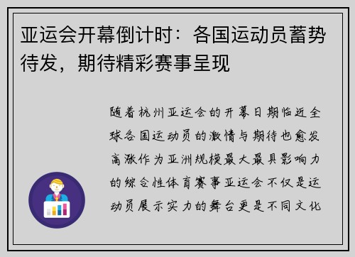 随着杭州亚运会的开幕日期临近,全球各国运...