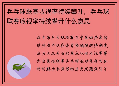 近年来,乒乓球联赛在中国的热度持续升温,...