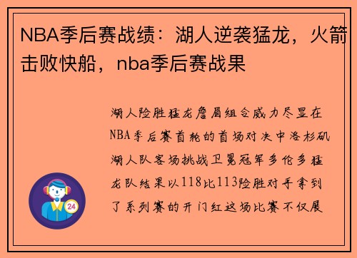 湖人险胜猛龙,詹眉组合威力尽显 在NBA...
