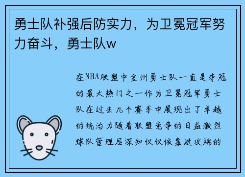 勇士队:从低谷到崛起 勇士队作为NBA历...
